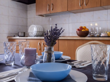 Klimatyzowany pokój trzyosobowy z aneksem kuchennym i łazienką /studio/, wyposażony w 24 calowy TV, internet bezprzewodowy, lodówkę, kuchenkę elektryczną, czajnik elektryczny komplet naczyń kuchennych. Łazienka wyposażona w natrysk, umywalkę, WC.